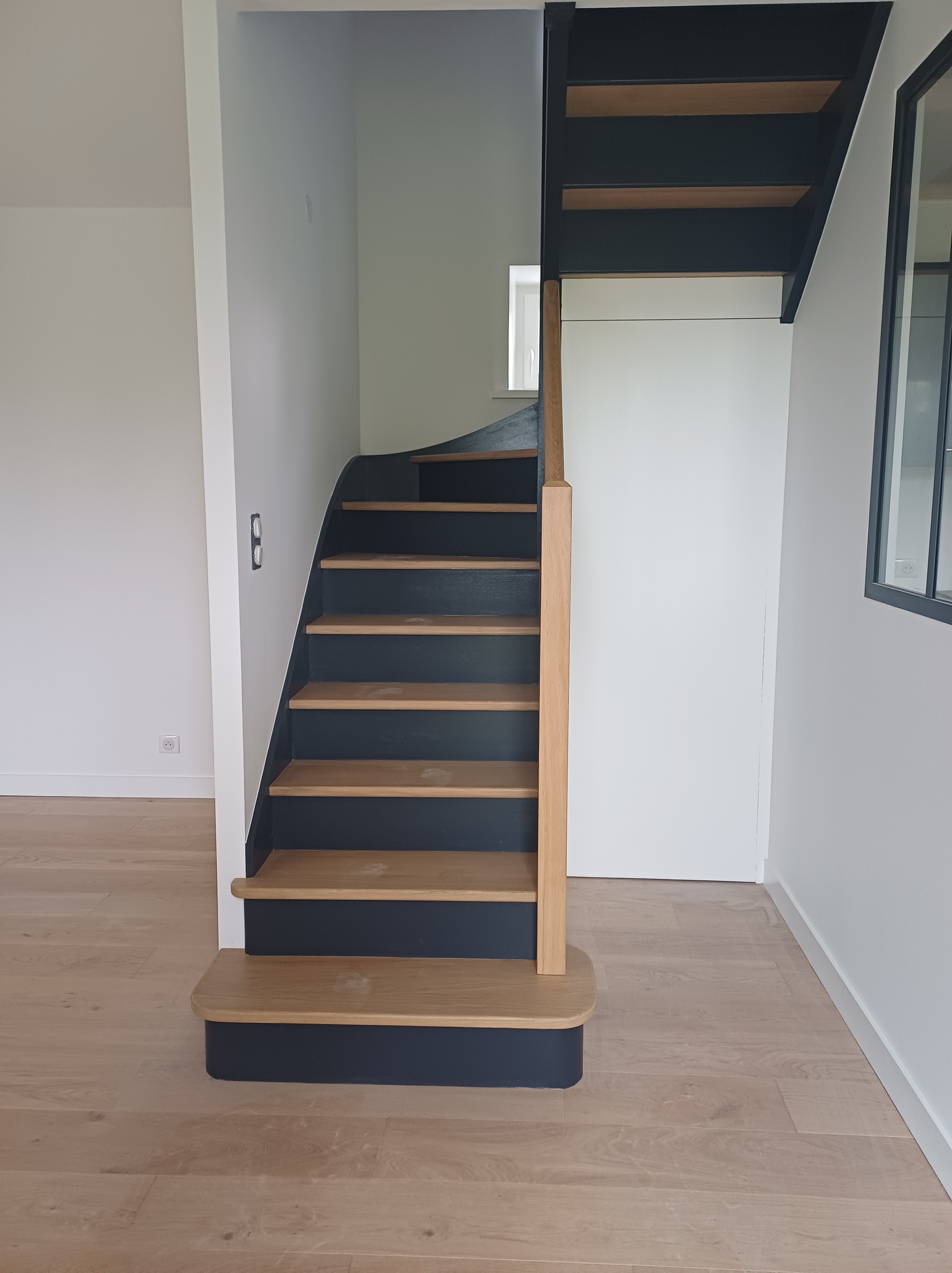 Le deuxième volume hébergeant les bureaux et les vestiaires à son tour fait écho à l’autre bâtiment présent sur le site et à l’usage côtoyant (service de restauration): enduit d’une teinte blanche, menuiserie gris foncé, toiture plate. Une façade en bardage bois (pose verticale) a été ajouté sur l’angle Sud-Ouest rappelant l’activité de menuiserie pratiquée dans l’ESAT, tout en apportant une image accueillante et chaleureuse.