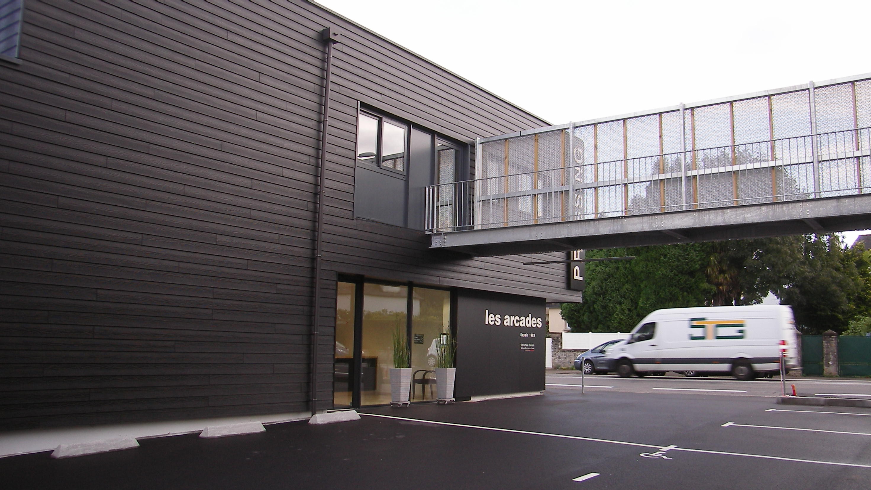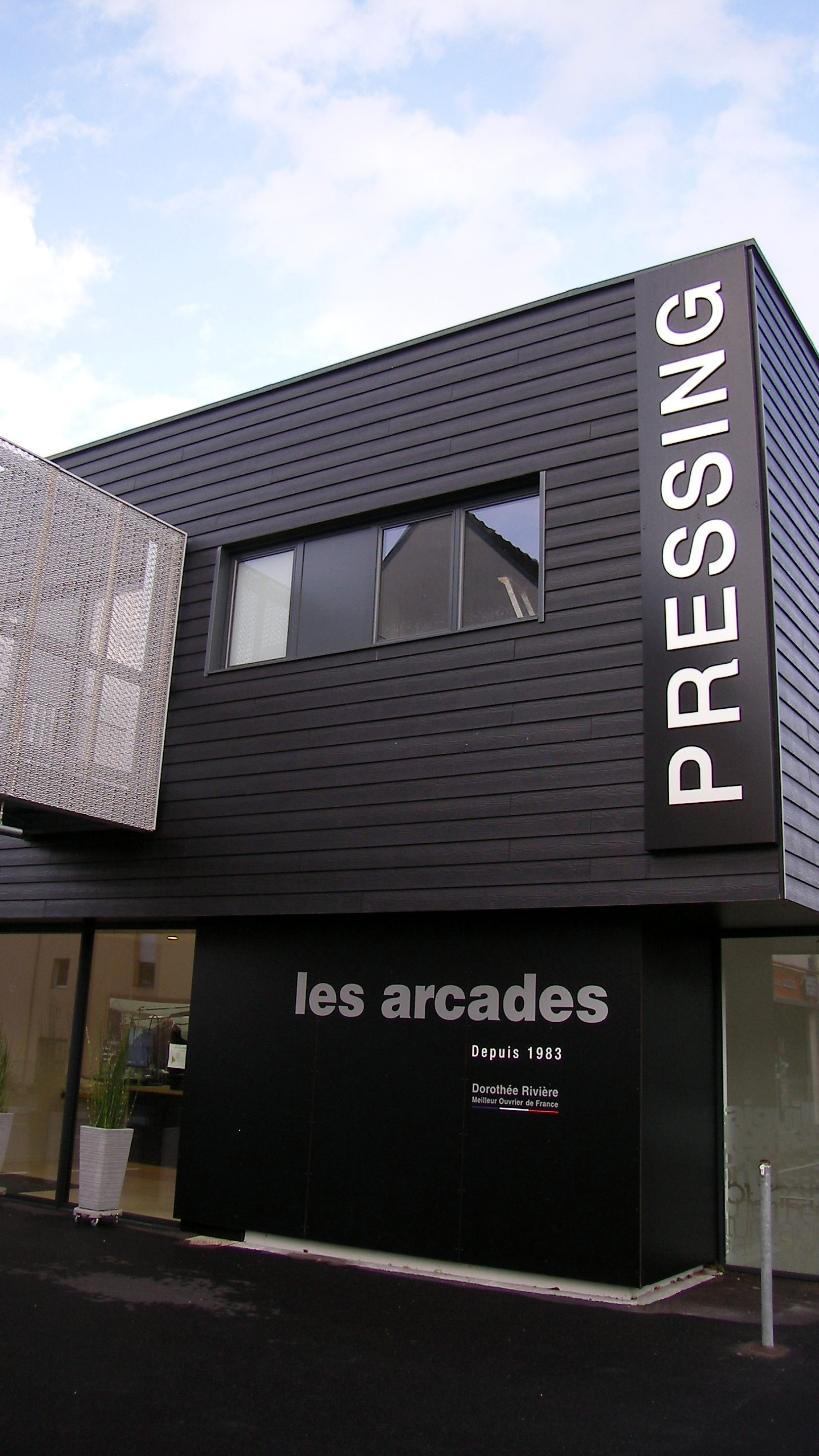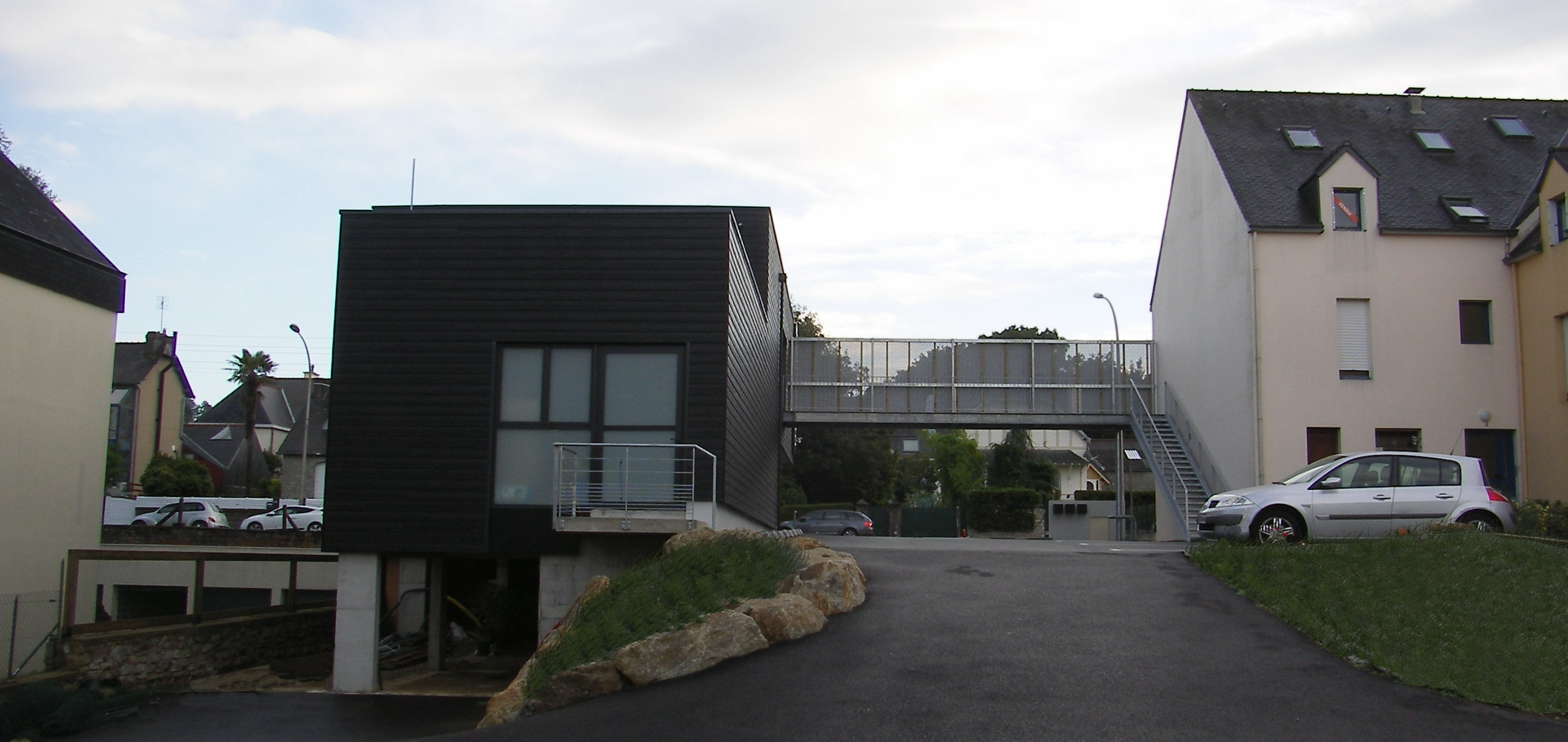 Les façades existantes sont repeintes dans la même teinte, et pour certaines rhabillées dans le même revêtements de façade que l’extension, en panneaux composites noir mat.