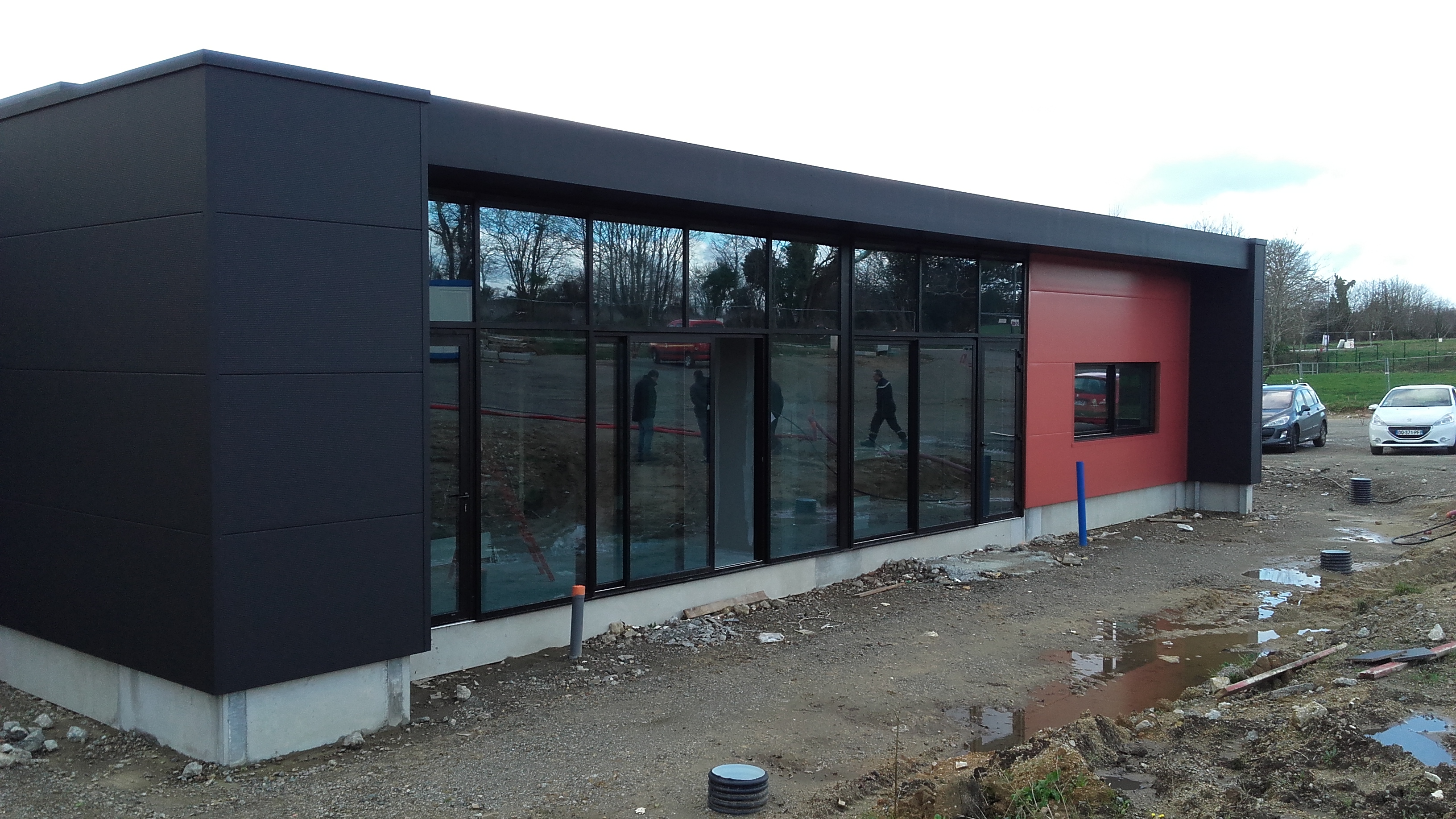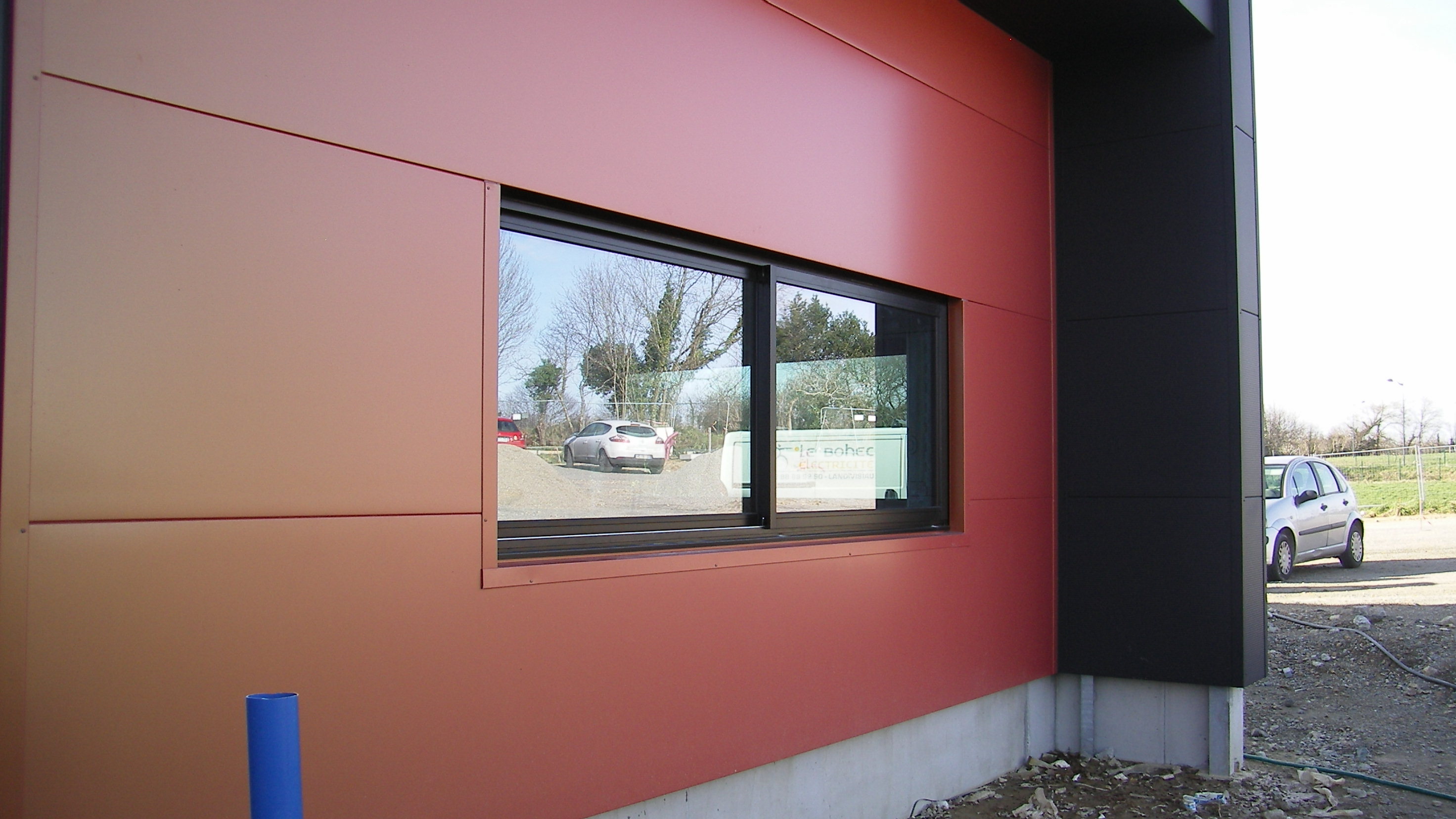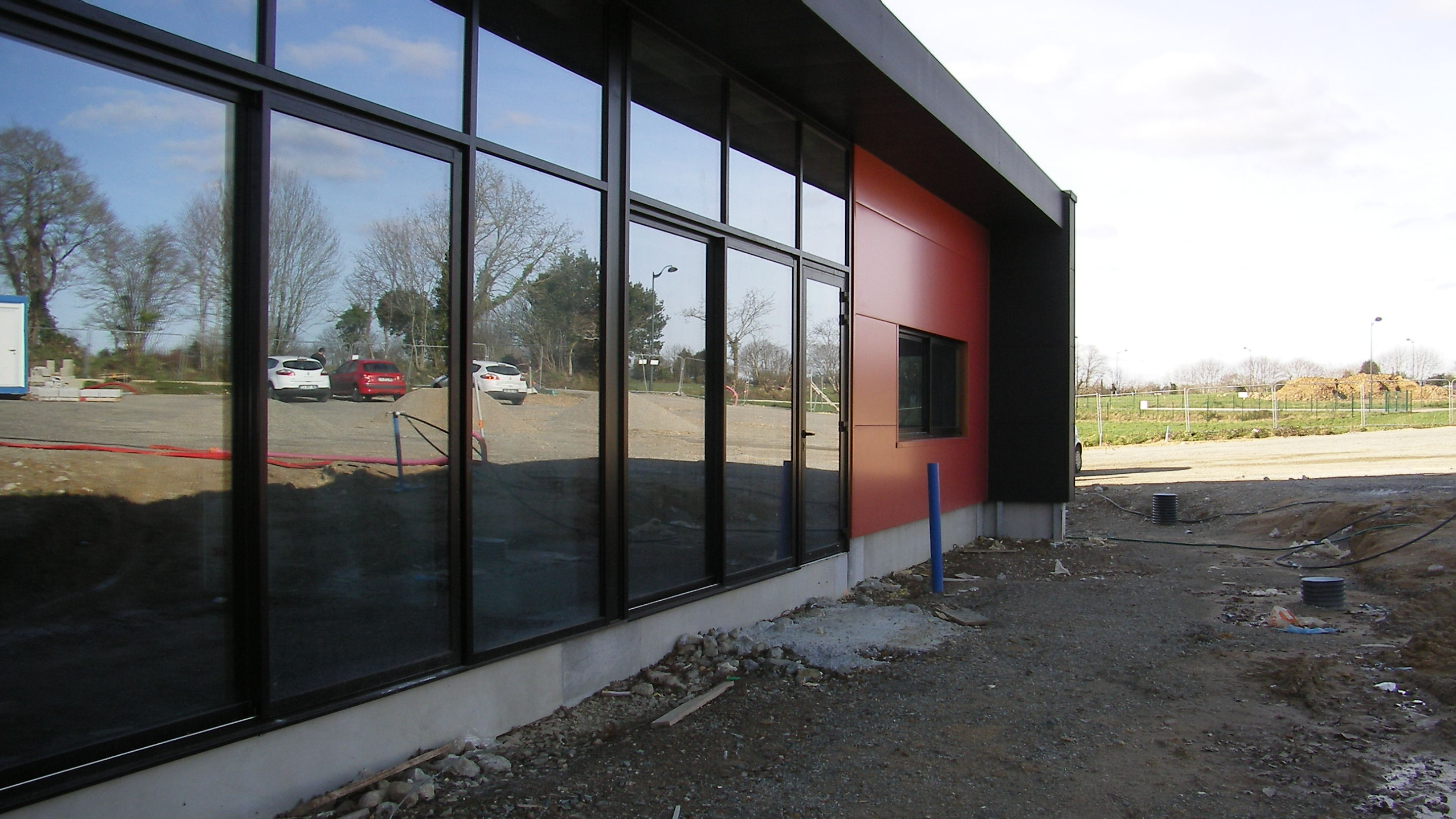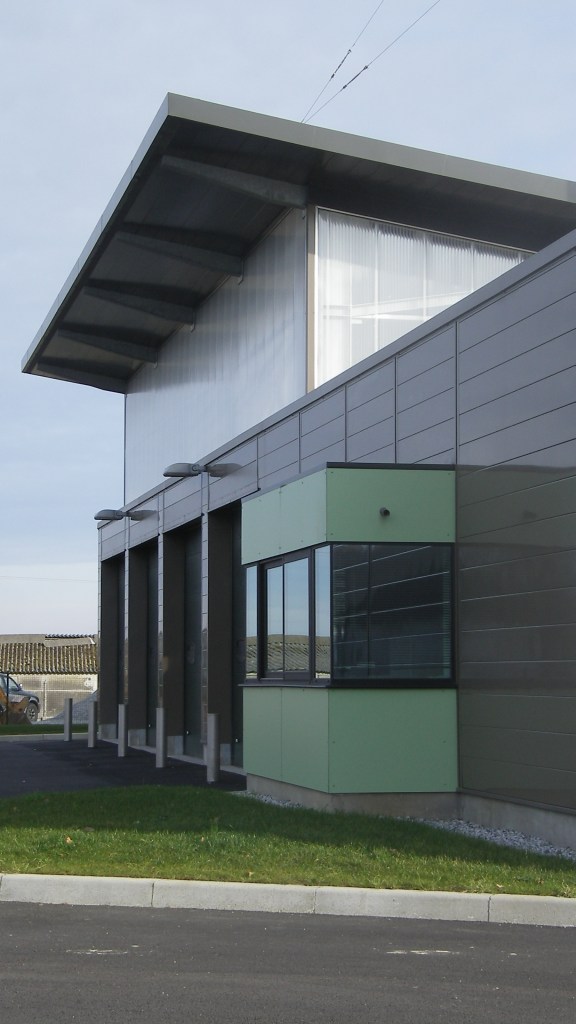 Le volume haut est réalisé en ossature métallique, il est recouvert d’un bardage métallique vertical avec une alternance de tons gris, les portes sectionnelles sont gris anthracite, elles sont marquées par un bardage métallique et un bandeau gris anthracite.