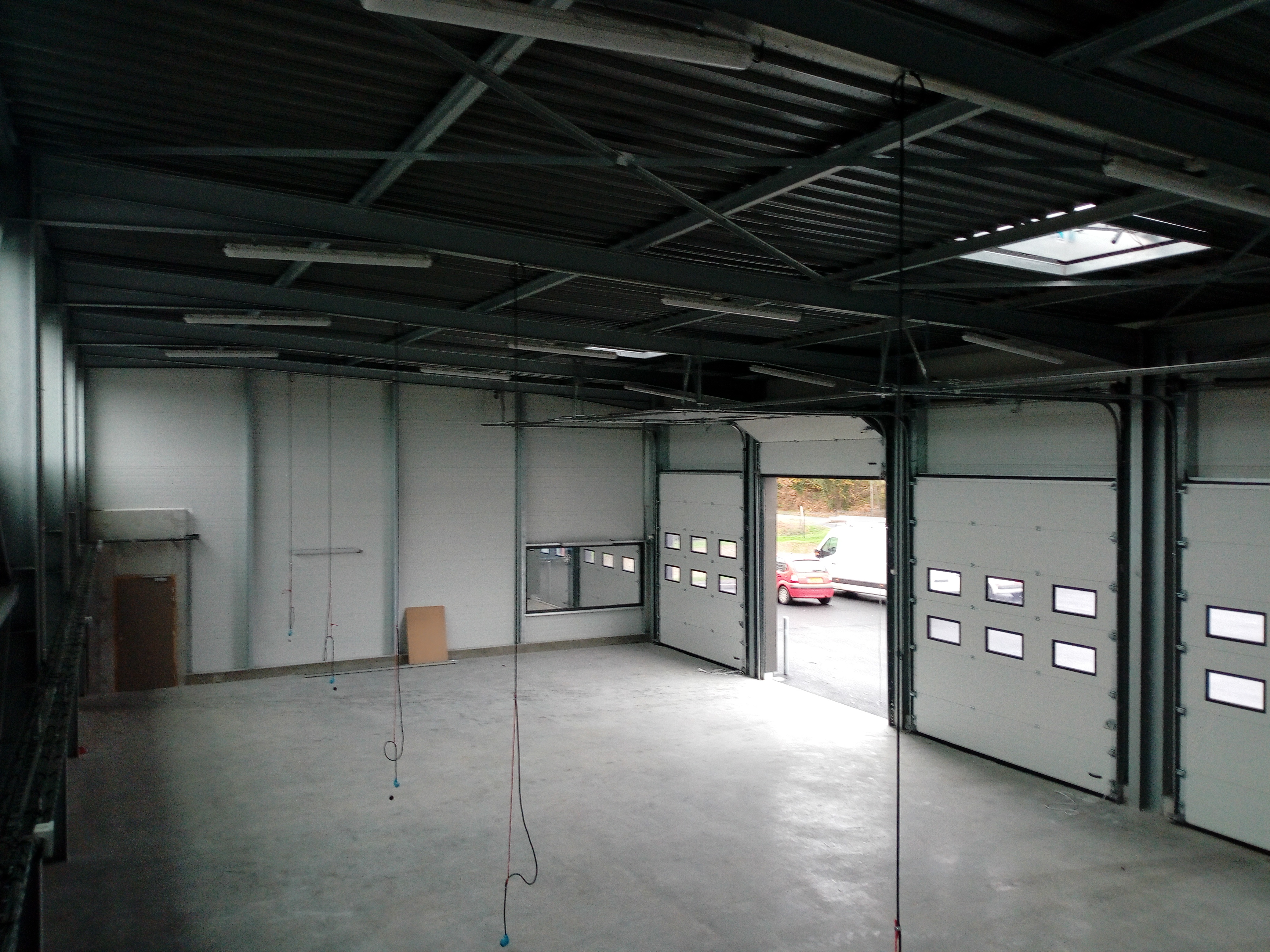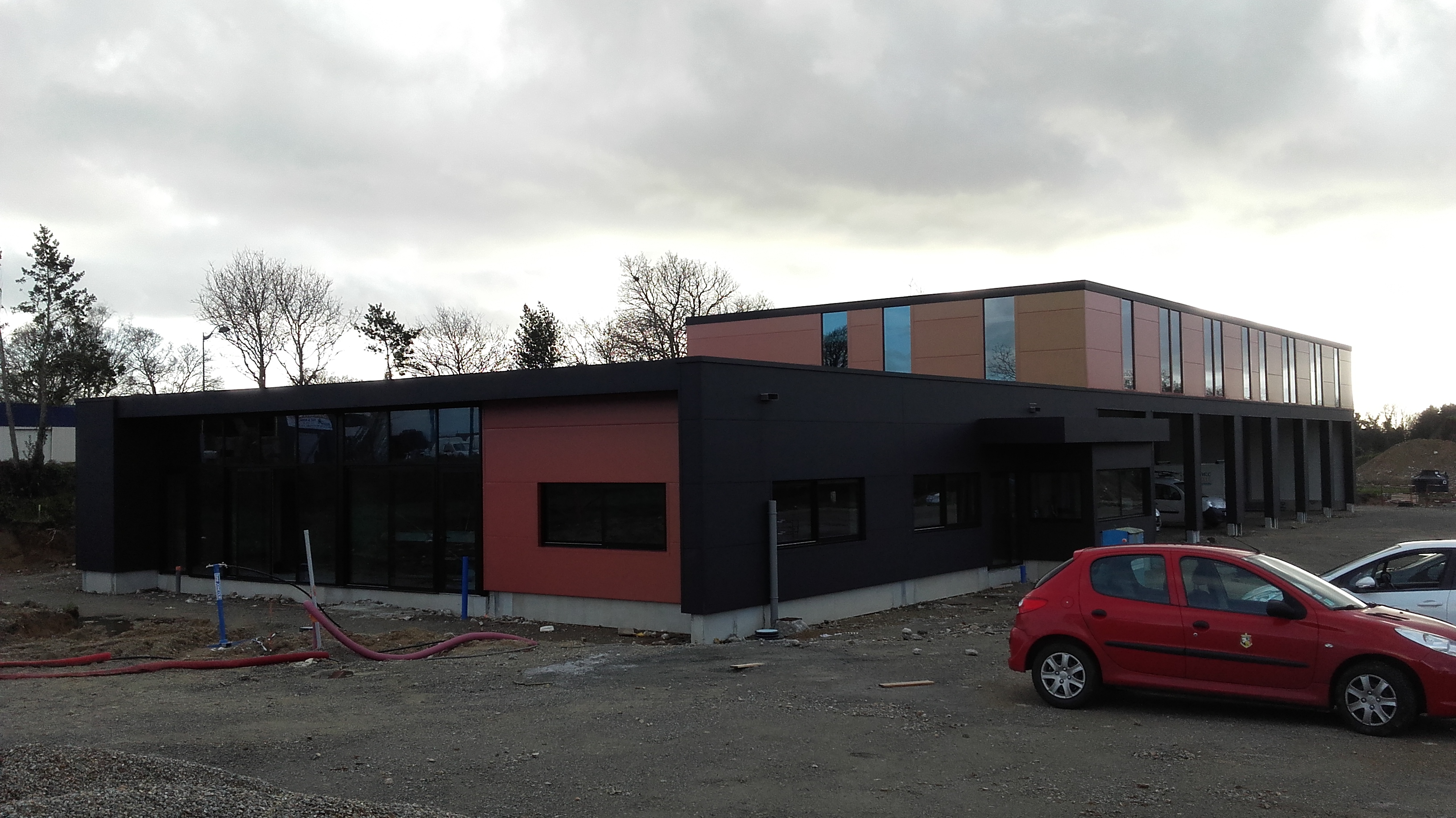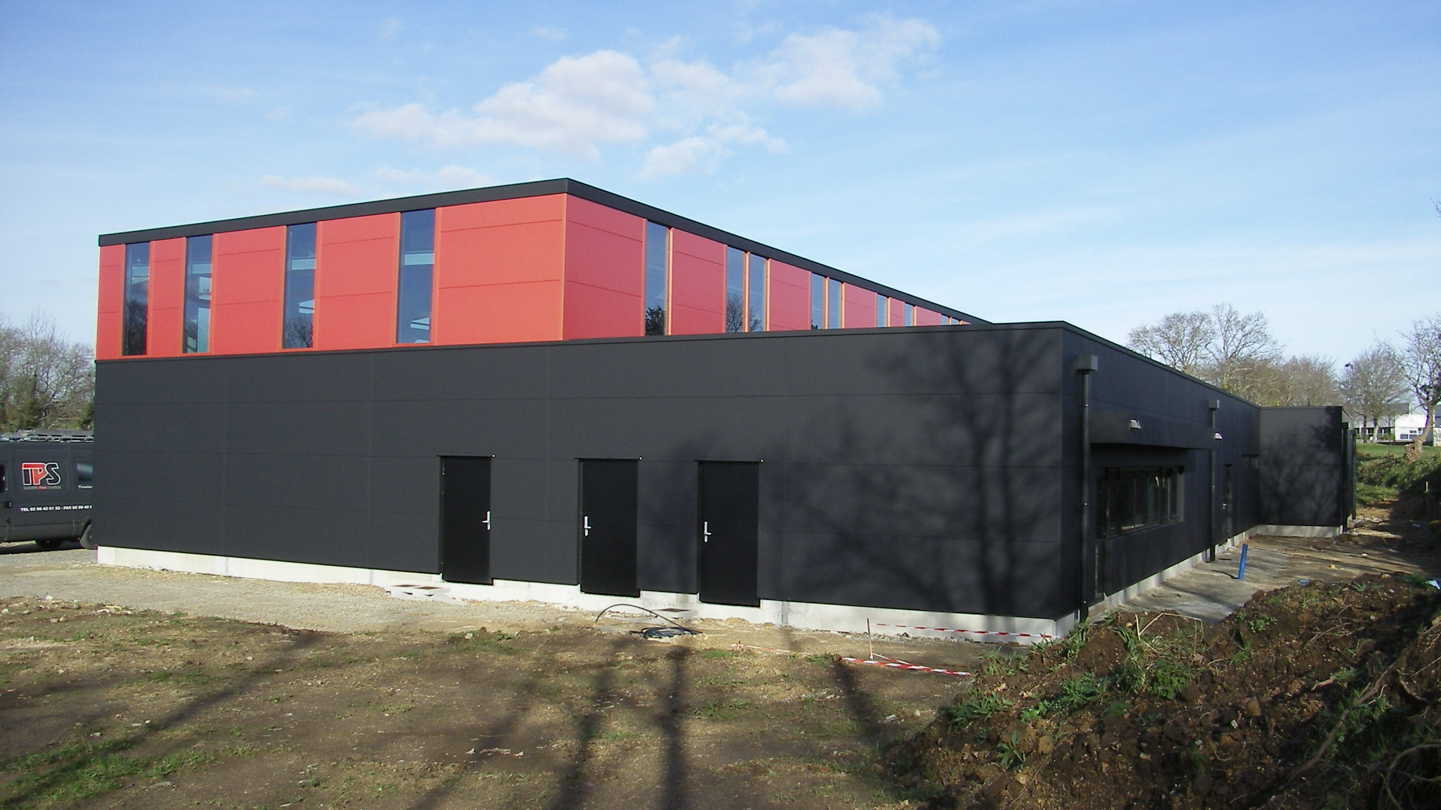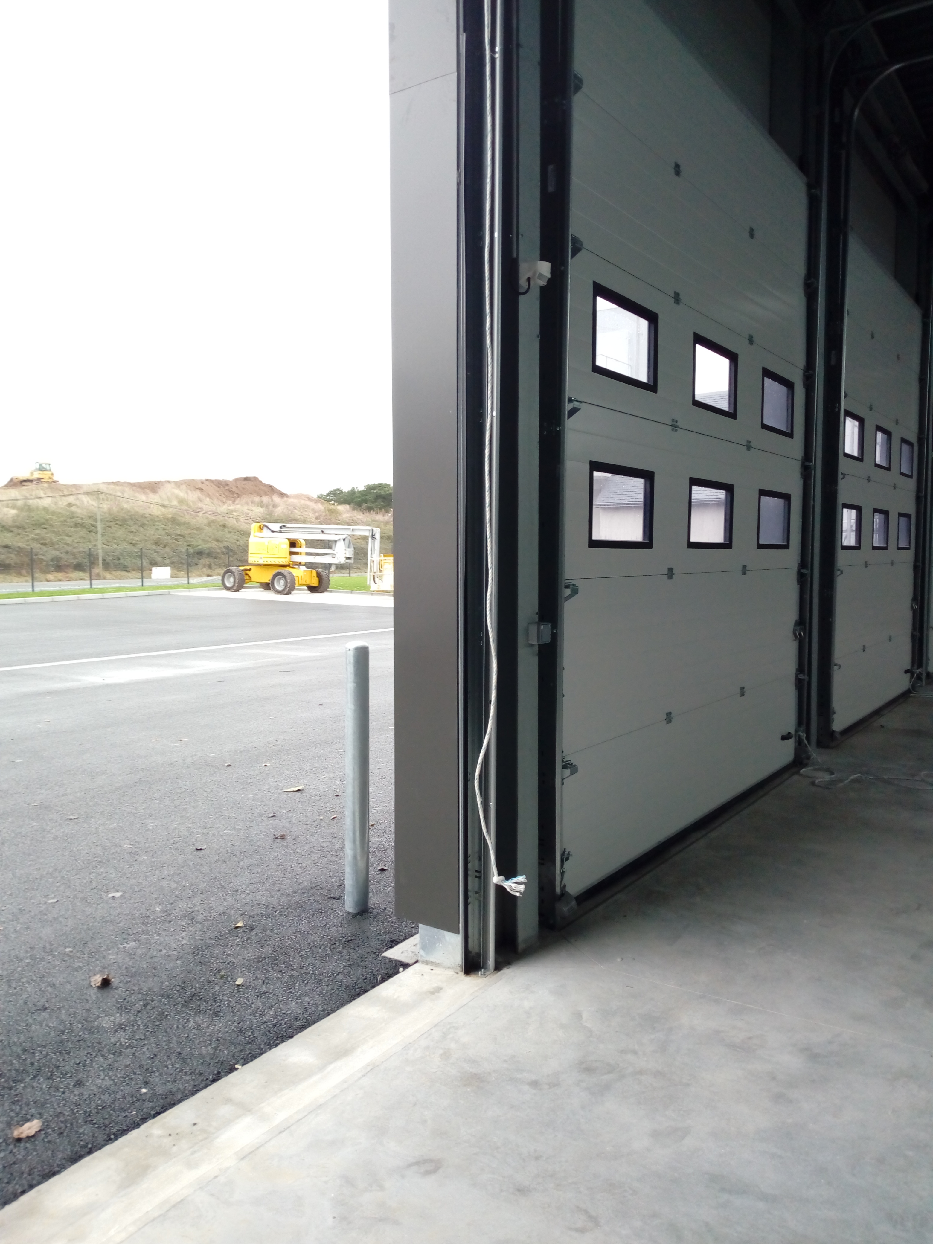 Le volume haut est réalisé en ossature métallique, il est recouvert d’un bardage métallique vertical avec une alternance de tons gris, les portes sectionnelles sont gris anthracite, elles sont marquées par un bardage métallique et un bandeau gris anthracite.