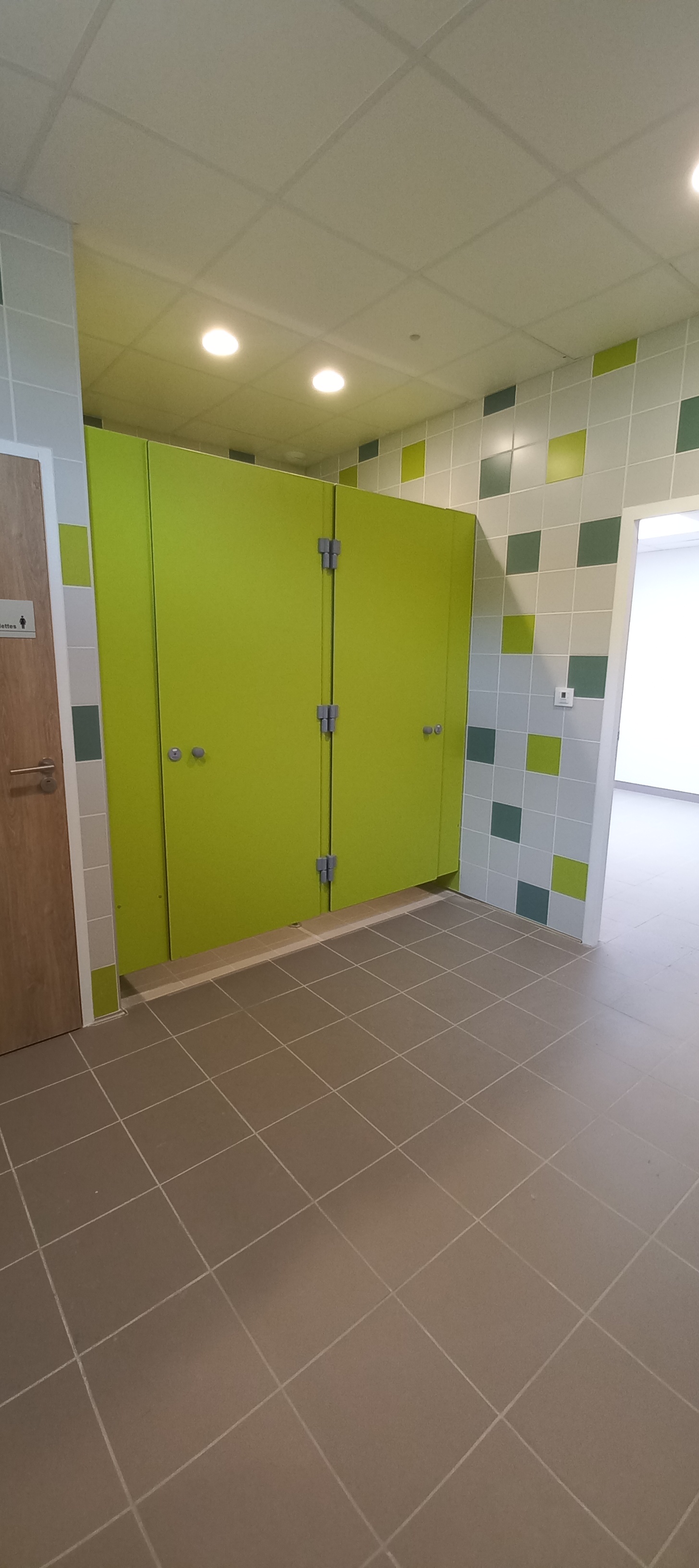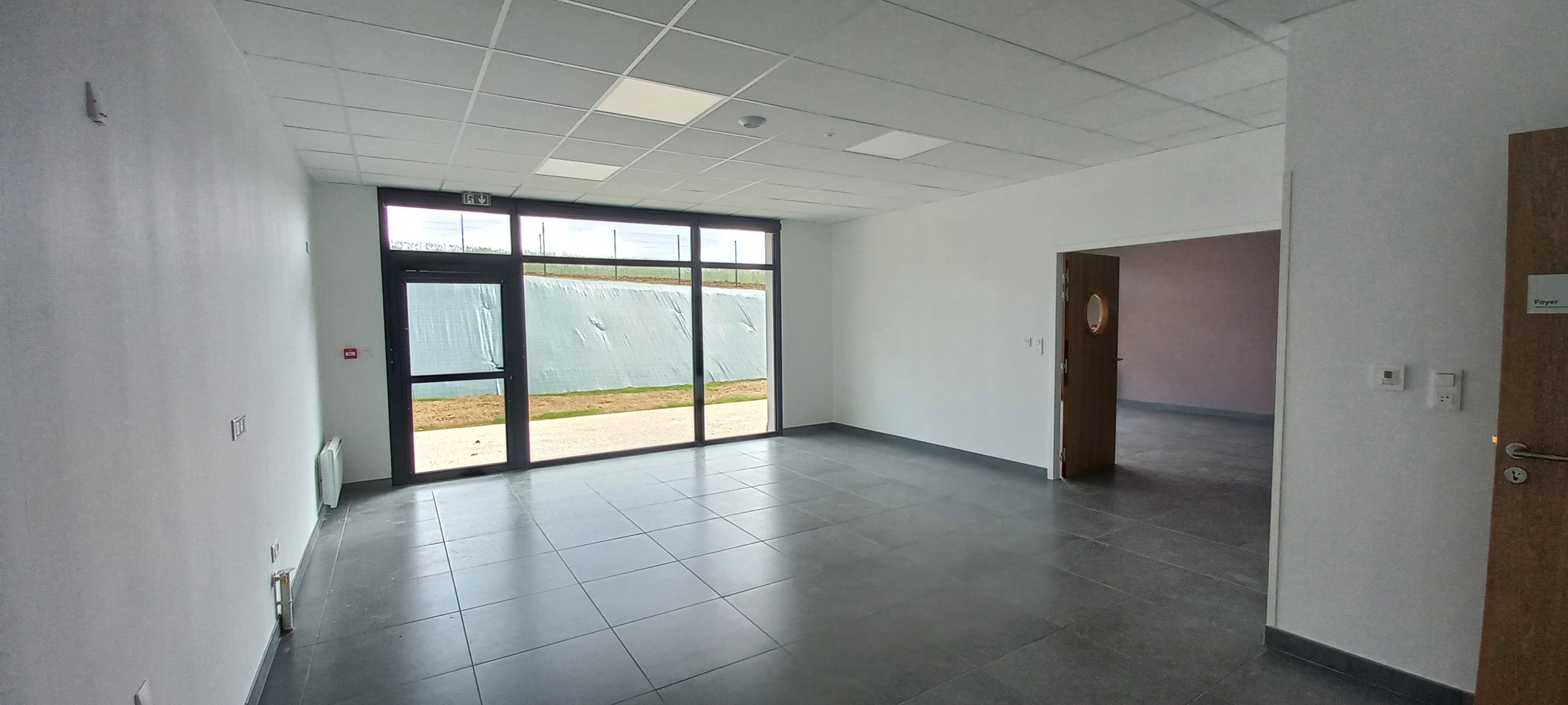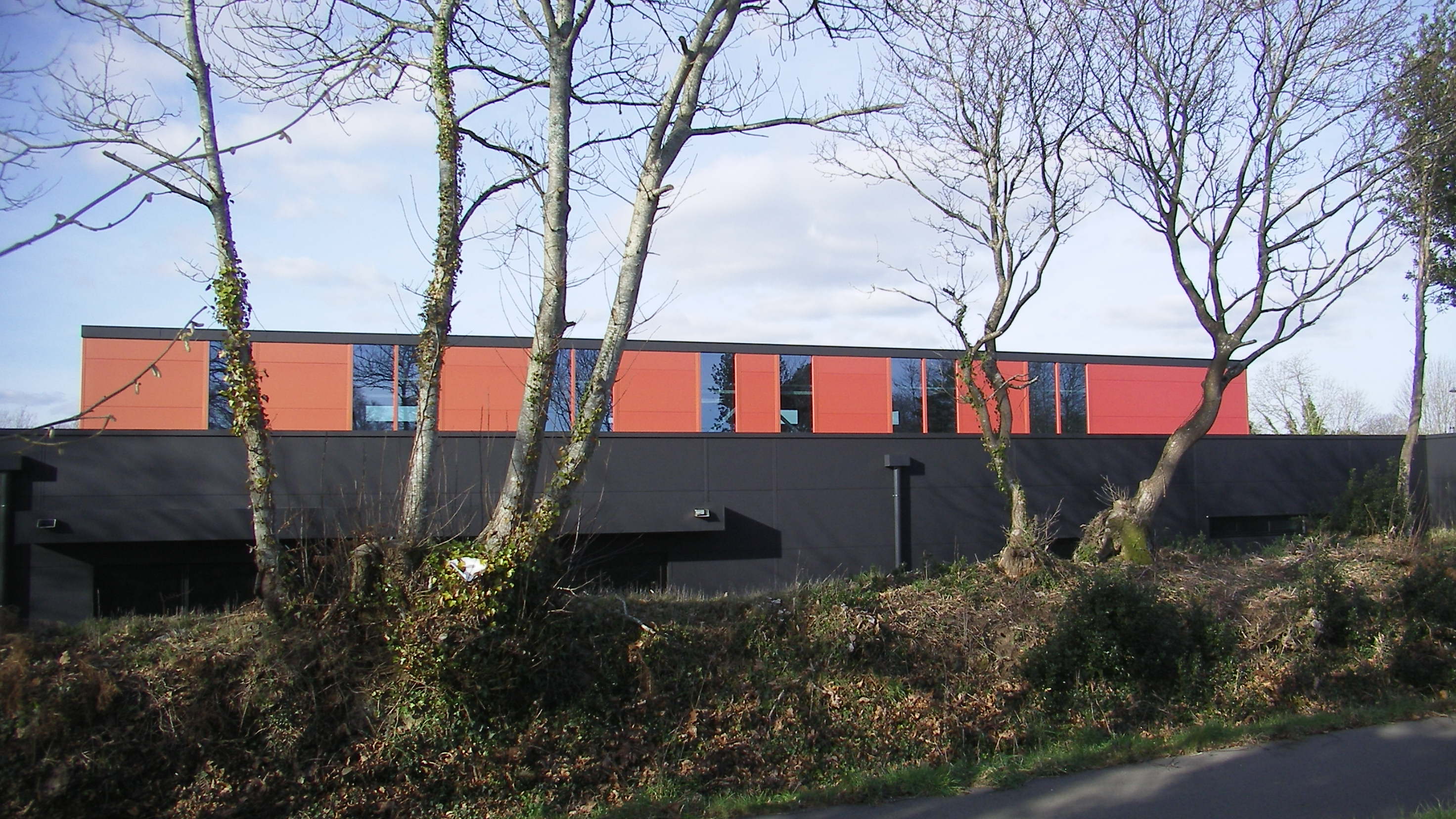 Le volume haut est réalisé en ossature métallique, il est recouvert d’un bardage métallique vertical avec une alternance de tons gris, les portes sectionnelles sont gris anthracite, elles sont marquées par un bardage métallique et un bandeau gris anthracite.