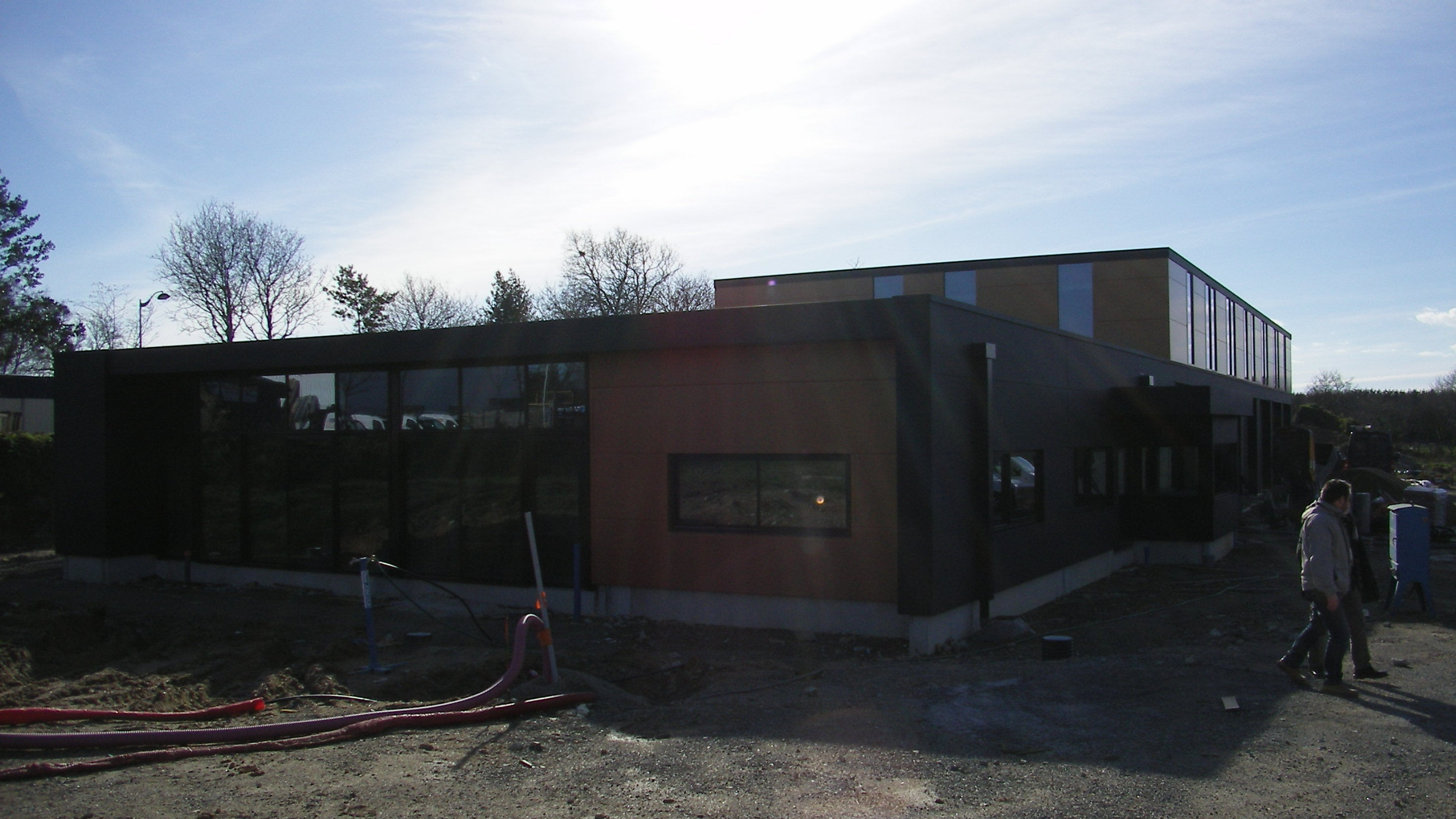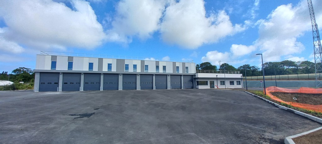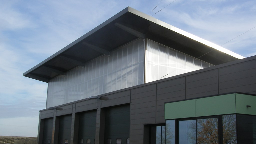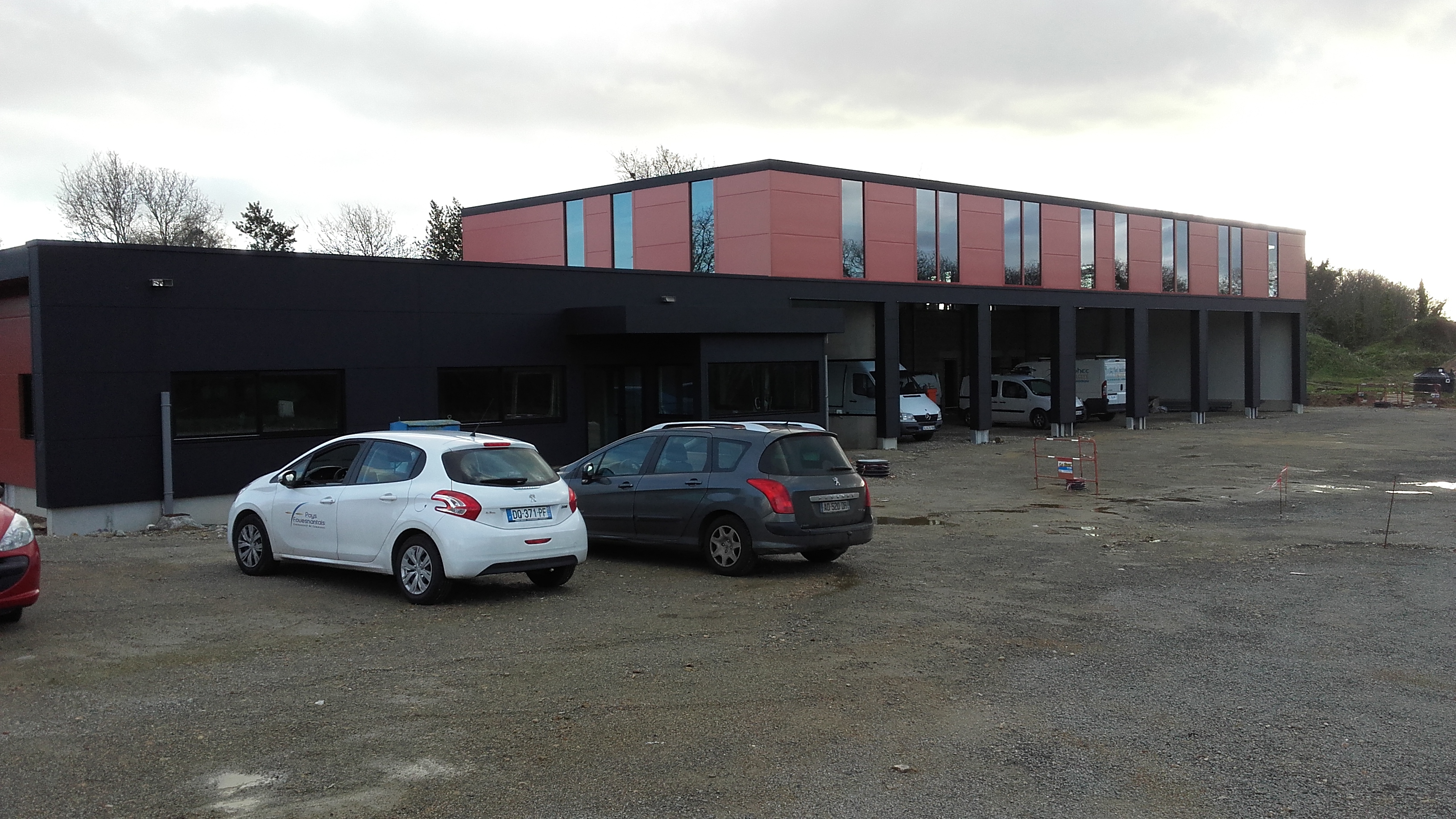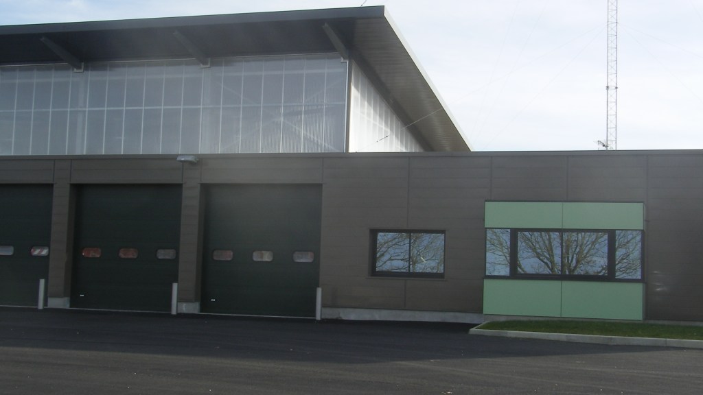 Le bâtiment comprend deux volumes, un volume « haut » abritant les remises, les locaux techniques opérationnels ainsi qu’une mezzanine combiné au volume « bas » regroupant les bureaux,