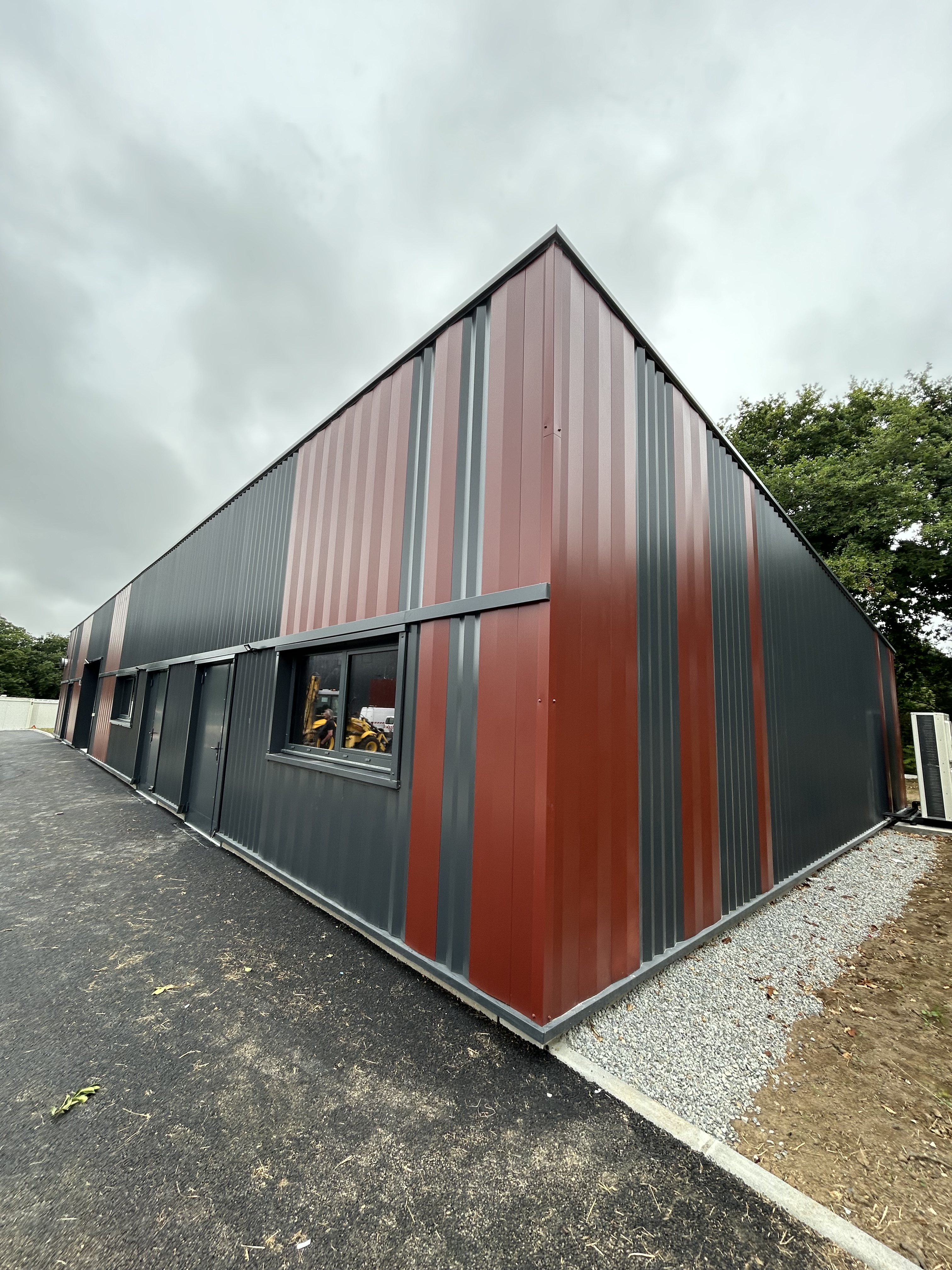 Le bâtiment comprend un volume unique, monopente en structure béton et isolation par l’extérieure capotée par un bardage métallique.
