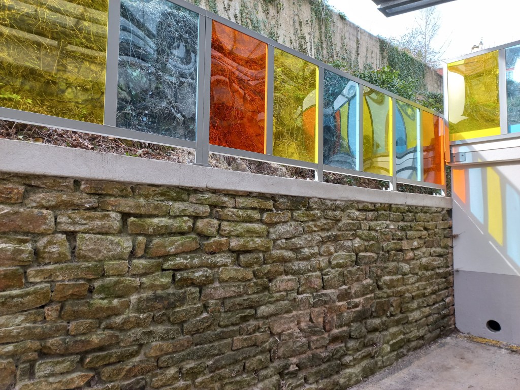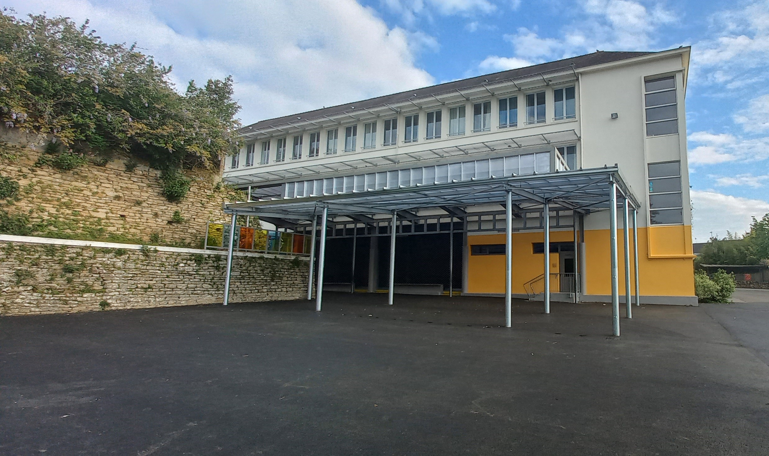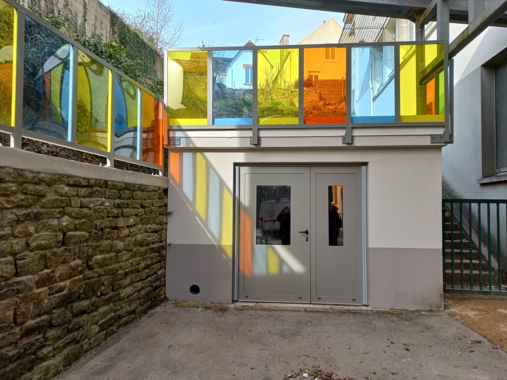 L’extension du préau est réalisée en acier galvanisé avec une couverture en Dampalon transparent. Les peintures du préau, d’une partie de la façade sud et du garage sont refaits avec des couleurs vives se rapprochant des couleurs existantes et en accord avec la clôture en Dampalon.