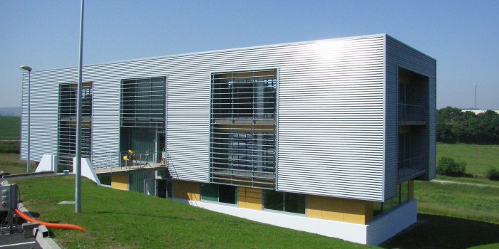 Afin de respecter les besoins du programme demandé, la volumétrie et la nature du terrain, le voisinage avec les bâtiments existants, ainsi que les distances par rapport aux limites de propriété, il s’est avéré nécessaire de créer deux volumes distincts. La première répond au besoin d’une remise des véhicules. Elle est accompagnée d’un auvent sur la limite parcellaire Sud complémentaire dans ses fonctions et servant d’un lieu de stockage. Le deuxième volume, plus petit et plus étroit, abrite des espaces de bureaux et des vestiaires.