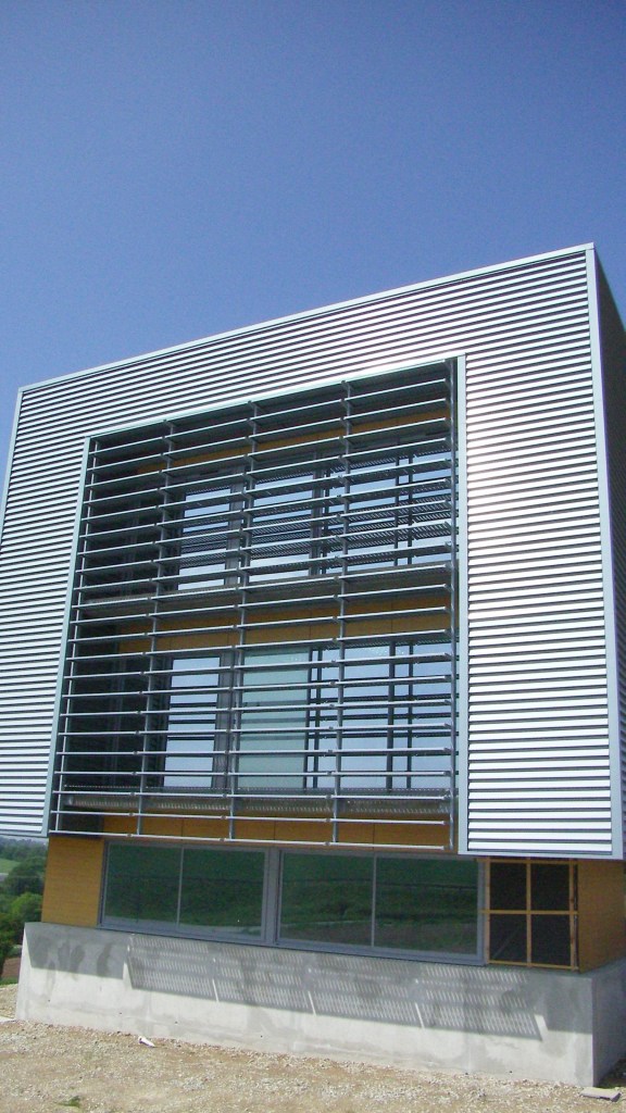 Le volume du garage ainsi que l’auvent reprennent le langage industriel du hangar bois existant au centre du terrain. La structure métallique est bardée de lames verticales en acier. Leur orientation alternée crée un jeu de lumière permettant la variation naturelle de deux teintes de gris utilisés.