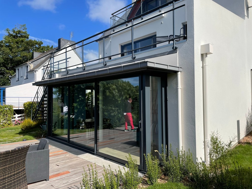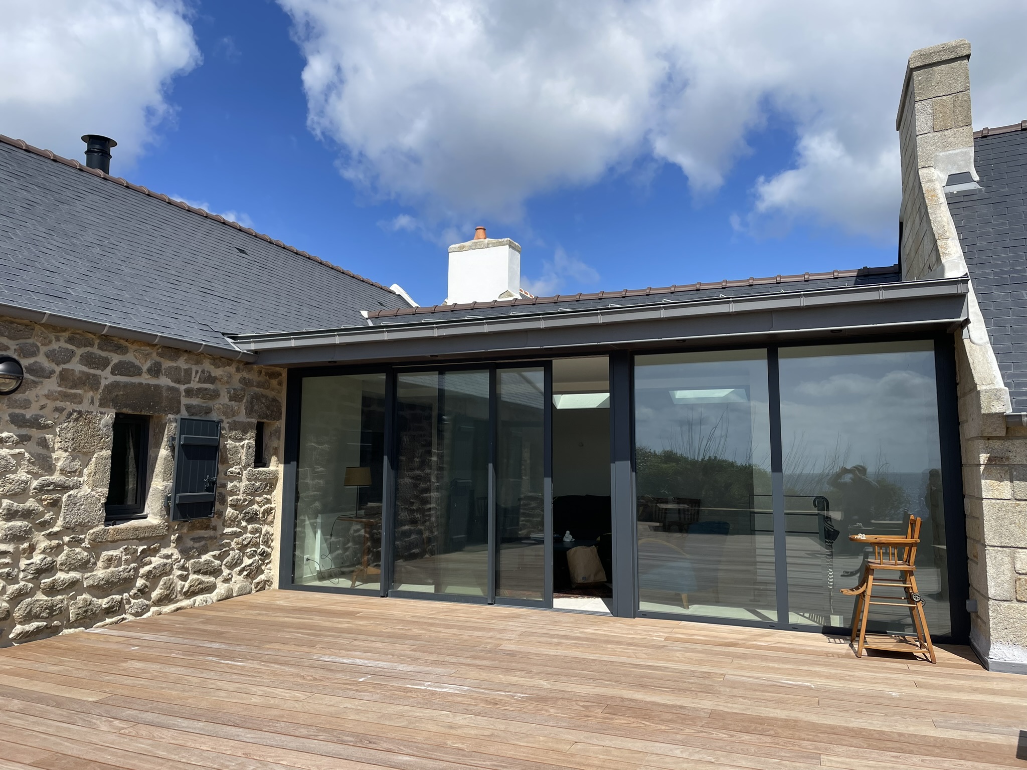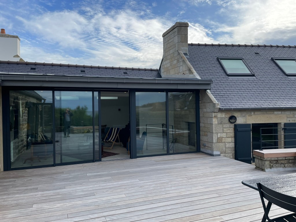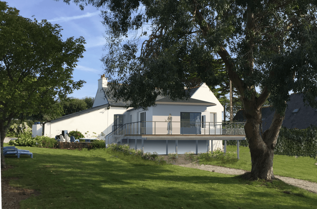On ouvre également un mur entier sur la véranda (elle-même restructurée) afin de bénéficier d’un grand espace de séjour avec la vue sur mer qui n’était pas mise en valeur dans l’existant.
