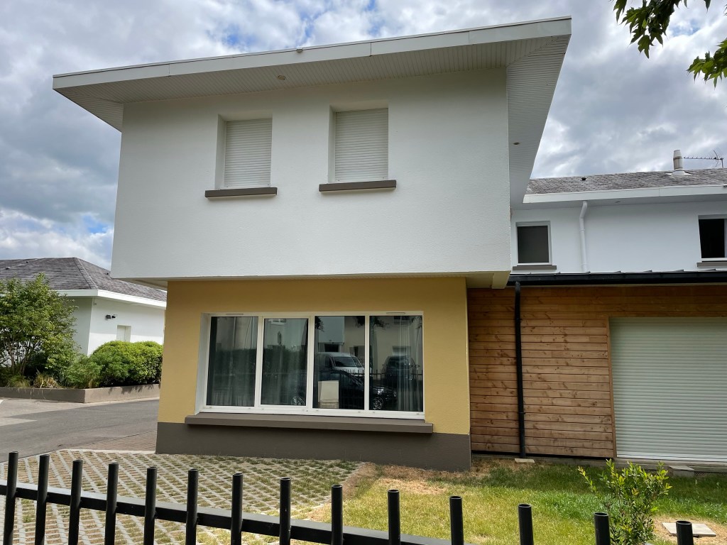 La seconde extension (bâtiment B) consiste en la réalisation de deux studios en RDC dans le creux entre deux pignons Ouest. En R+1, toutes les chambres sont transformées en studios. Ce que induit quelques adaptations en façade, notamment des baies, côté sud, des allèges créées, un balcon supprimé.